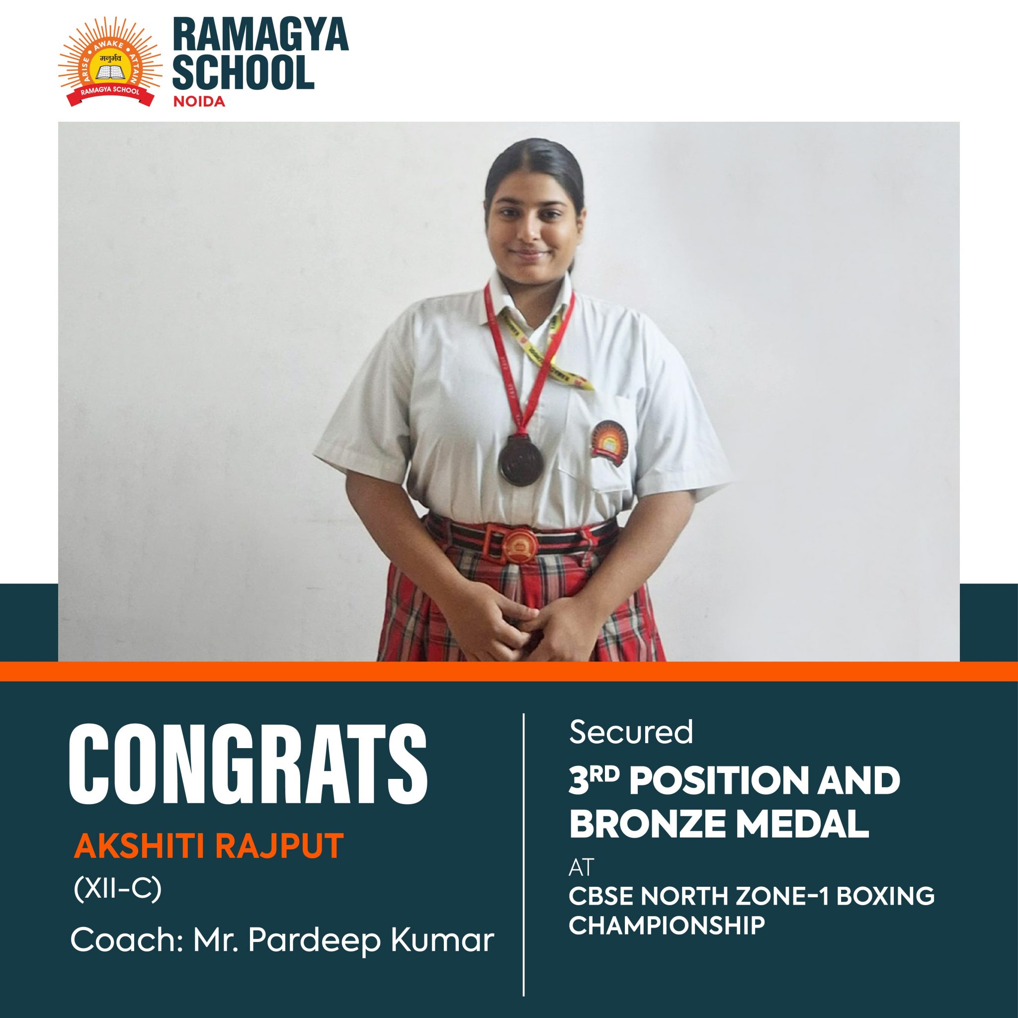 We are proud to announce that Akshiti Rajput, a student of Class 12-C, has secured the third position and won a bronze medal in the Under-19 Girls category at the CBSE North Zone-1 Boxing Championship 2024. The championship took place at Social Baluni School in Dehradun, Uttarakhand.