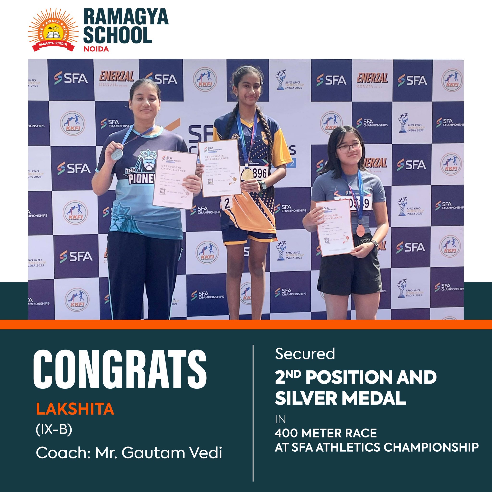 Lakshita of Class 9B has achieved a remarkable 2nd place in the 400-meter race at the SFA Athletics Championship, earning a prestigious silver medal in the Under-16 Girls category. The event took place at Nehru Stadium, where she displayed exceptional dedication and athleticism.