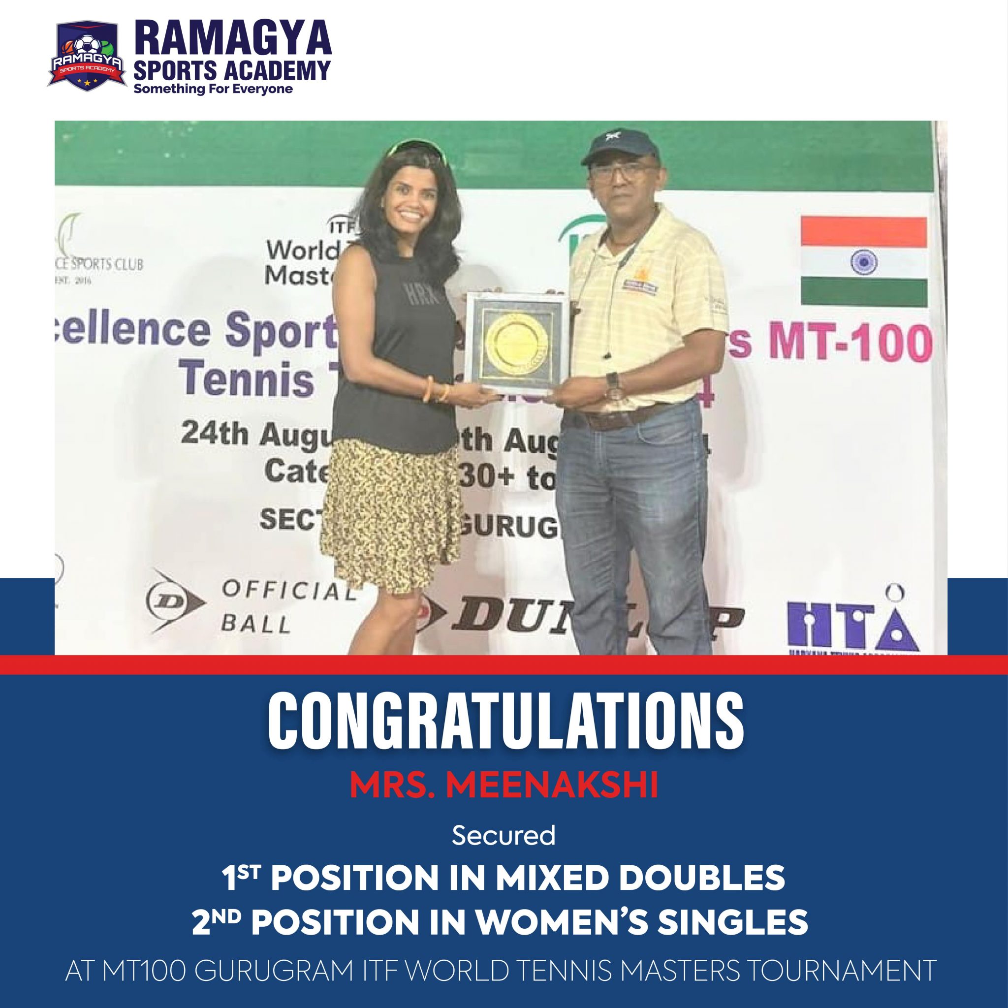 We are delighted to share the exciting news of Mrs. Meenakshi’s outstanding performance at the MT100 Gurugram ITF World Tennis Masters tournament. At this highly competitive event, Mrs. Meenakshi achieved remarkable results, winning 1st place in Mixed Doubles and securing 2nd place in Women’s Singles.