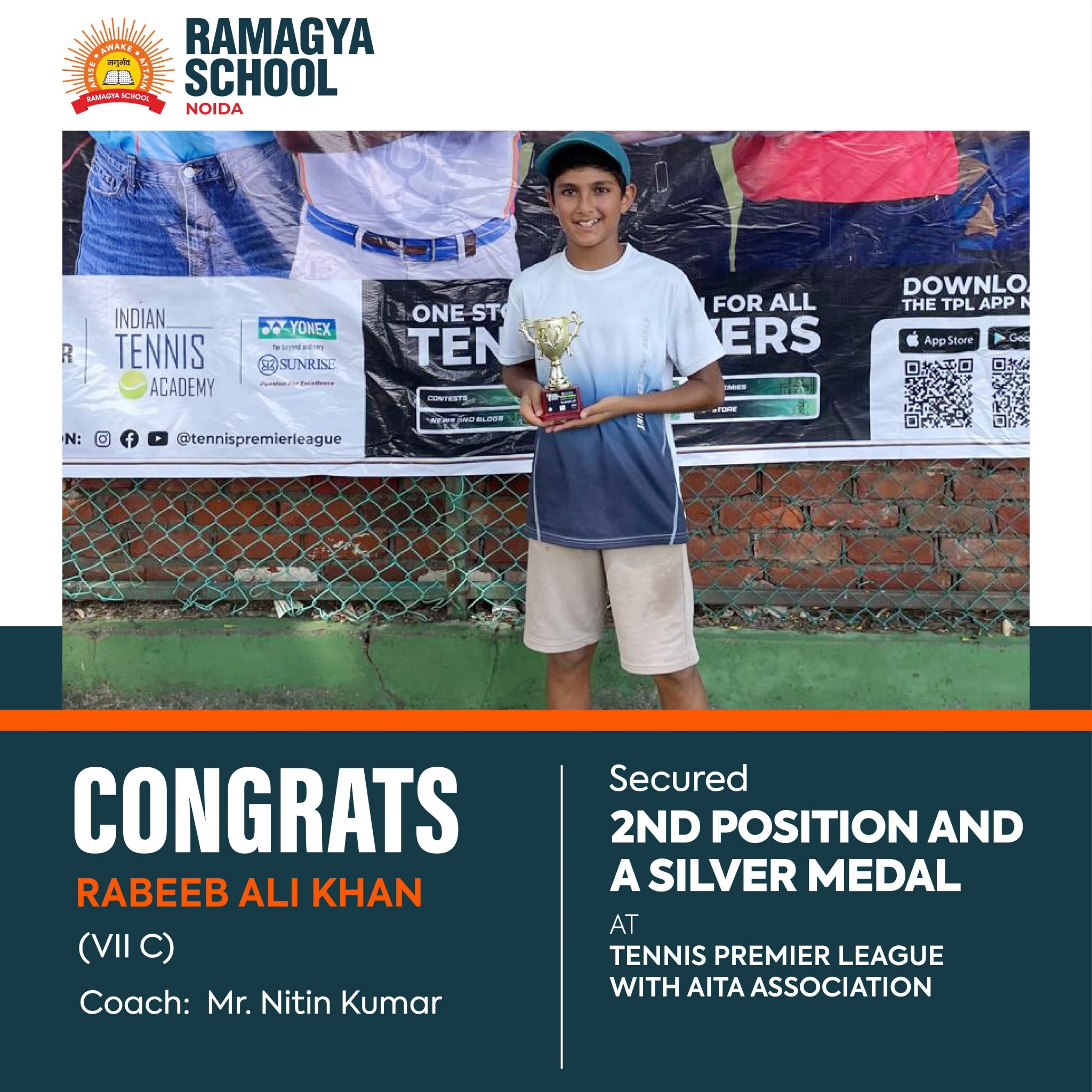 Rabeeb Ali Khan from Class VII-C has achieved an impressive second place in the Tennis Premier League (TPL) with AITA Association, competing in the U-14 Boys category. Held at Modern School in New Delhi from August 3 to 4, 2024, this prestigious TPL Ranking championship was a significant platform for showcasing young talent.