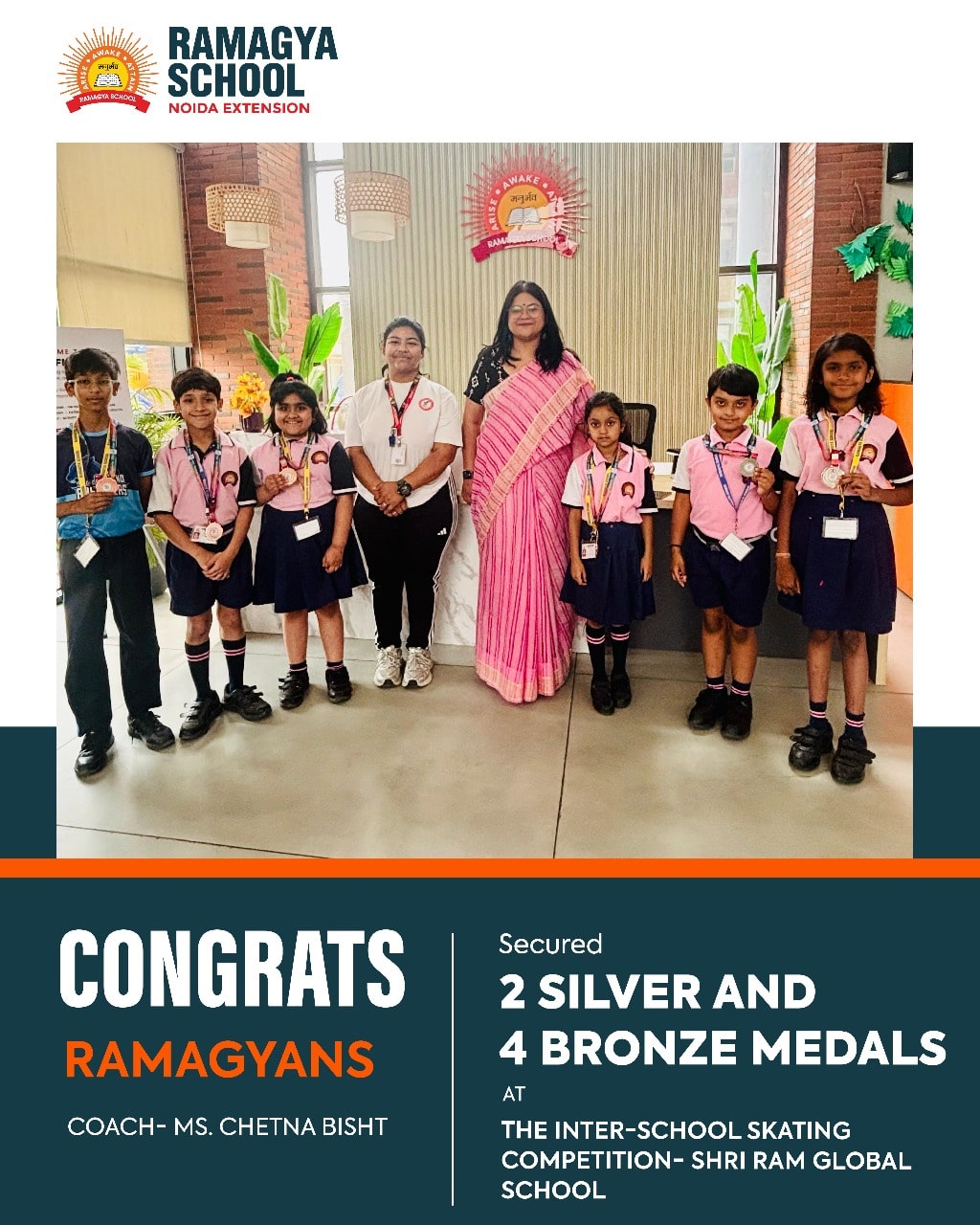 Ramagya School proudly celebrates the incredible achievement of its young skaters who brought home 6 medals at the Inter-School Skating Competition held at Shri Ram Global School. Our students displayed impressive technique, determination, and sportsmanship on the rink, under the dedicated mentorship of Coach Ms. Chetna Bisht.