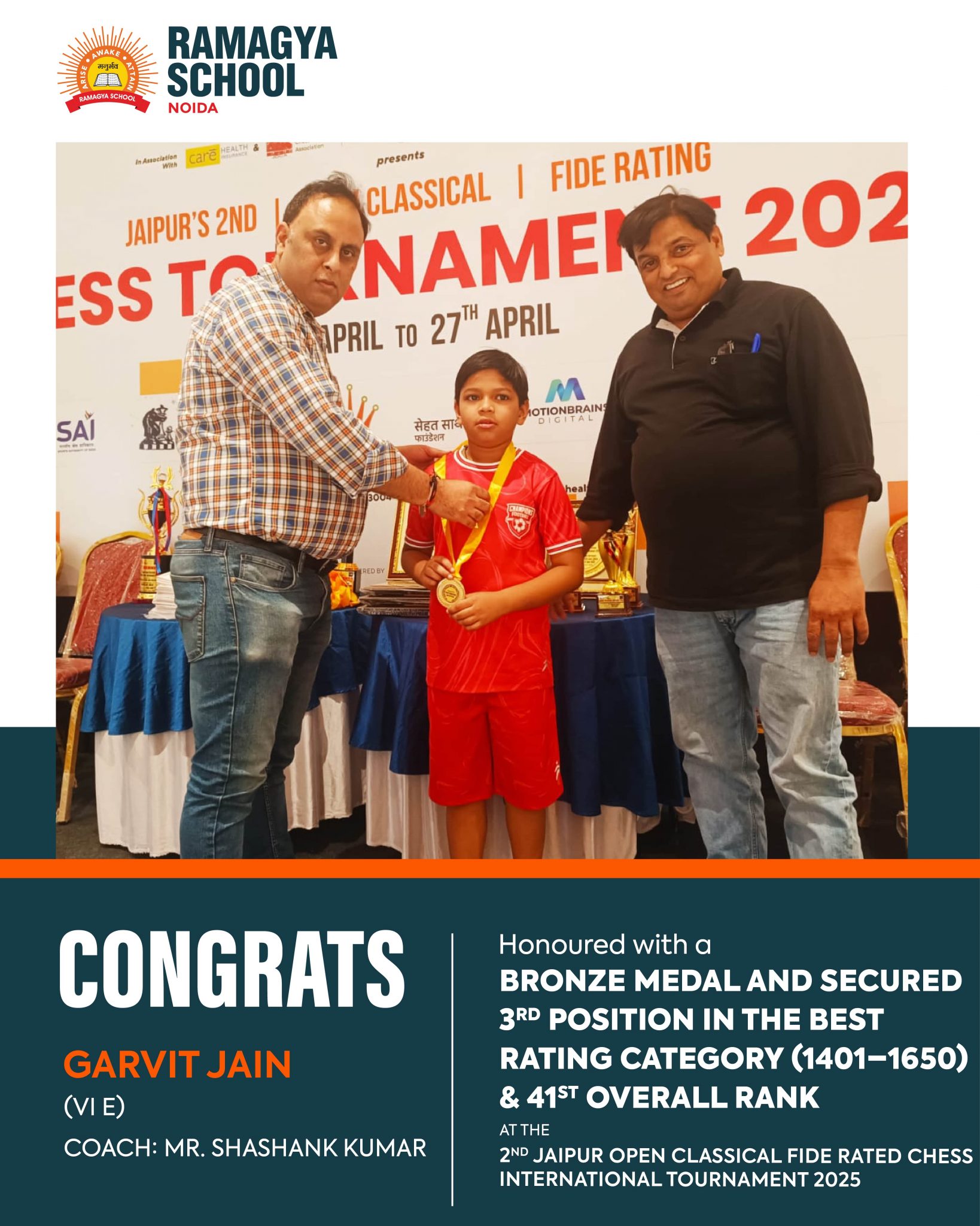 Ramagya School proudly congratulates Garvit Jain, a student of Grade VI-E, for his commendable performance at the 2nd Jaipur Open Classical FIDE Rated Chess International Tournament 2025, held from 23rd to 27th April at Jaipur Club, Rajasthan.